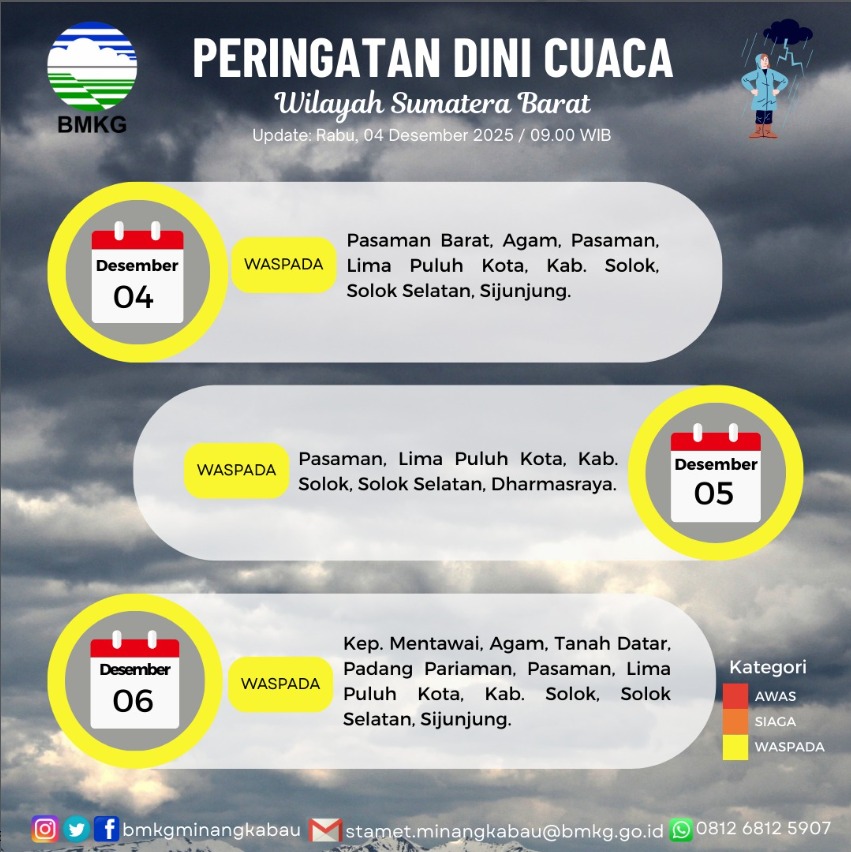 PADANG SippSumbar.com– Badan Meteorologi, Klimatologi, dan Geofisika (BMKG) Wilayah Sumatera Barat mengeluarkan peringatan dini cuaca untuk tiga hari ke depan, mulai dari 4 hingga 6 Desember 2025. Sejumlah wilayah diimbau untuk WASPADA terhadap potensi hujan lebat yang dapat disertai petir dan angin kencang. Peringatan ini dikeluarkan berdasarkan pembaruan data cuaca pada Rabu, 04 Desember 2025, […]